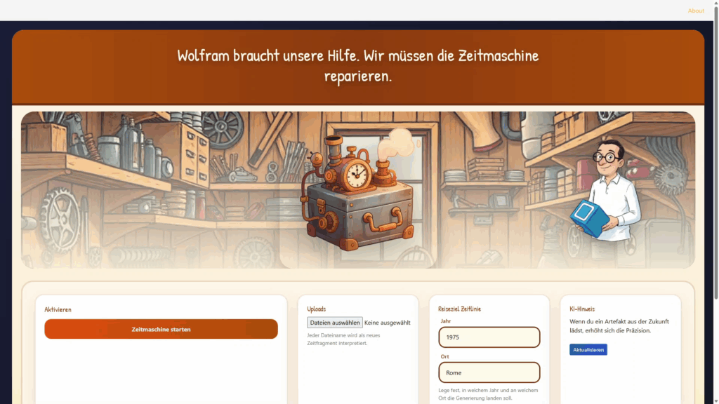 Die Idee: Wir bauen gemeinsam eine virtuelle Zeitmaschine! Jeder Nutzer trägt Puzzlestücke als Teile der Maschine bei – Bilder, Texte, Ideen – und die KI verbindet alle Beiträge zu einem kohärenten Gesamtwerk.