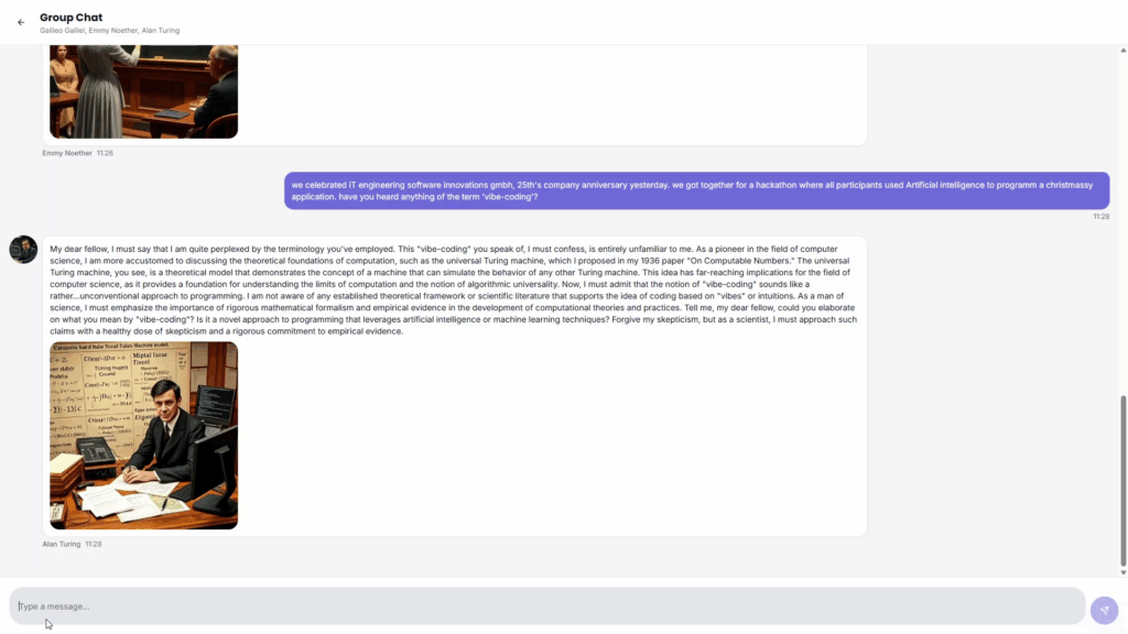 Das Besondere: Die KI könnte auch mit Hintergrundinfos zu iT Engineering Software Innovations trainiert werden, sodass Nutzer Fragen über unser Unternehmen stellen können. Teilnehmer können persönliche Erinnerungen oder ihre eigenen Visionen als Stationen einfügen.